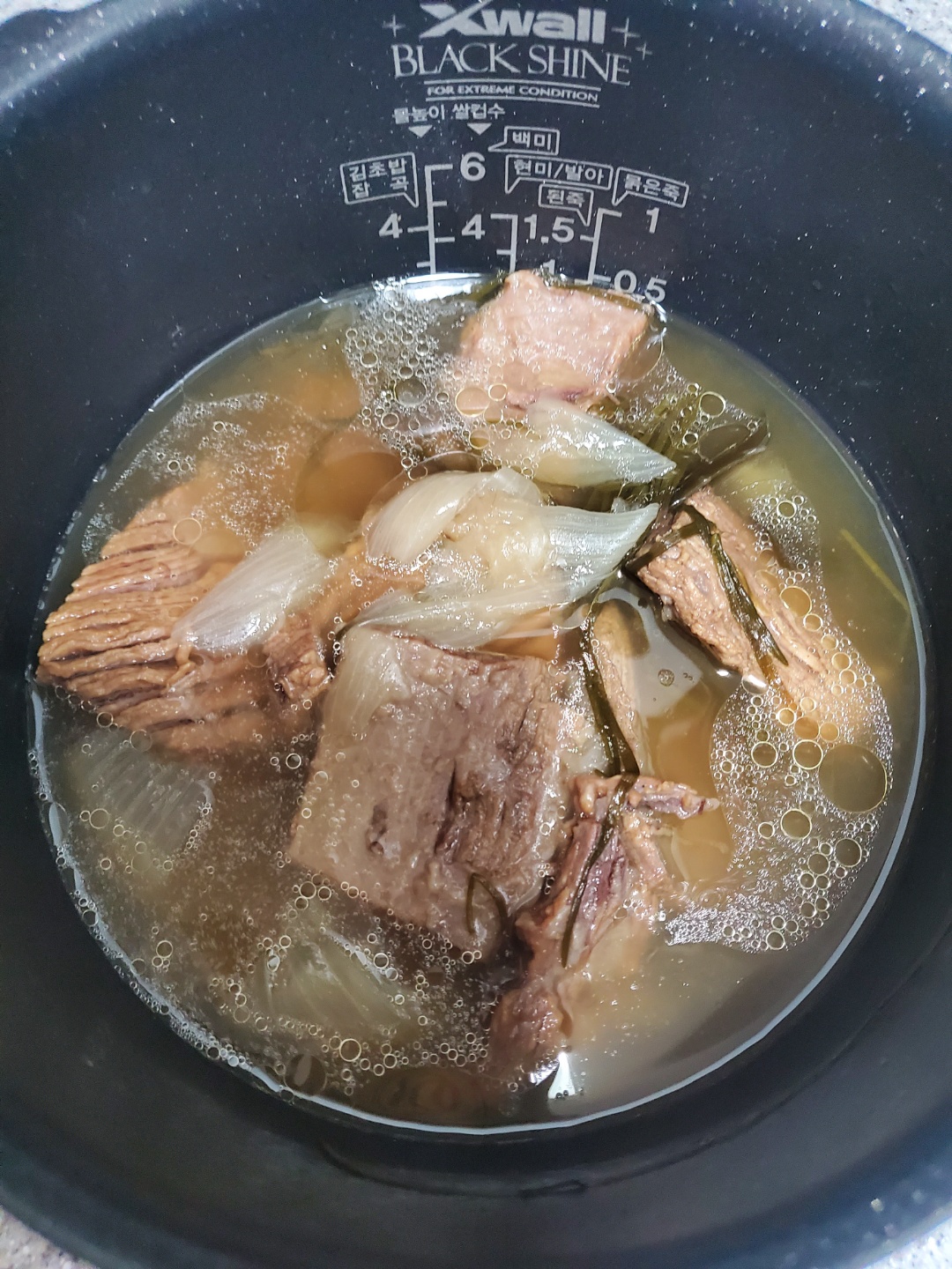 3. 밥솥에 대파, 통후추, 다시마, 양파, 삶은 양지 고기를 넣고, "만능찜" 기능으로 60분 가량 조리해 주세요.